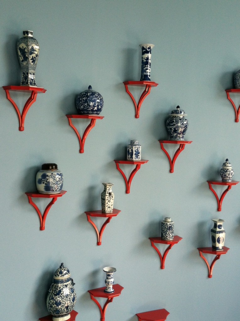 In this case, antique China in classic blue-and-white patterns rests atop bright red sconces, creating an eye-catching color contrast.