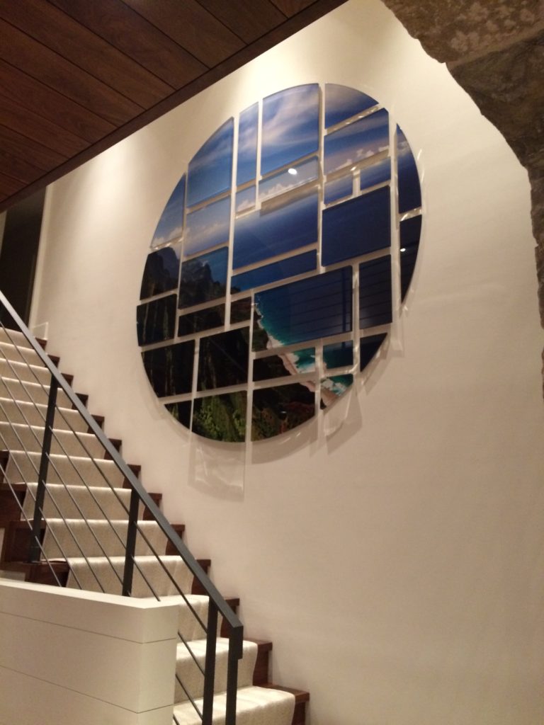 This next project certainly falls into the category of “complicated wall art” installations. Not that it was an impossible job, it just required a little more care and precision than if we were hanging a few family photos. Why? Because the singular art piece in question was actually made up of more than two dozen different pieces of plexiglass. Plus, the shape of the piece was a perfect circle, meaning not only did each piece have to be exactly spaced and level, but when finished, the entire work as a whole had to be just the right shape.