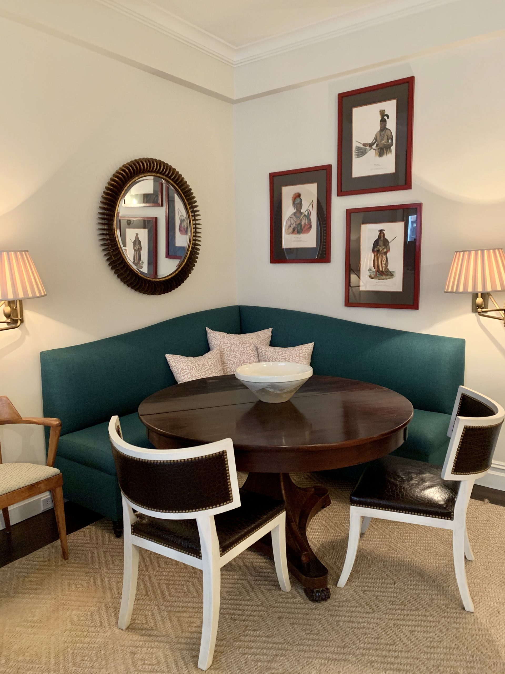 Who doesn’t love a great breakfast nook? This family can spend hours enjoying a meal, playing a game, having a conversation, surrounded by photos of their friends and family. The black and white photos create contrast with the bright orange banquette. Many smaller framed pieces pique the interest of the viewer who can see all of the pieces up close in this intimate space.