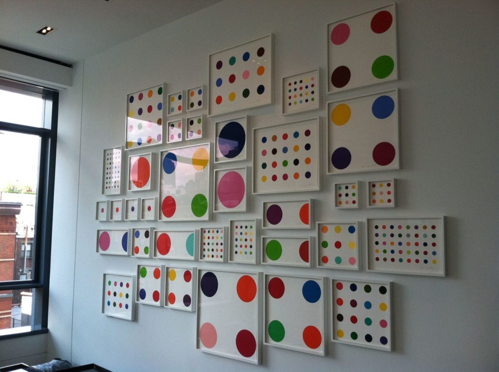 Usually we post photos of our finished professional art hanging projects. Today we have rare shots of the process as it’s unfolding. Here’s Jack working with this collection of Damien Hirst spot paintings. First, he lays out this salon style installation on the floor where he can work with the pieces like a jigsaw puzzle to find the most appealing arrangement. He’s paired up some similar pieces by spot size and frame size, and will place many pieces with an equal amount of space between frames to create consistency. Yet there are some pieces that defy these rules, proving that this installation is a work of art requiring a designer’s eye to make it sing.