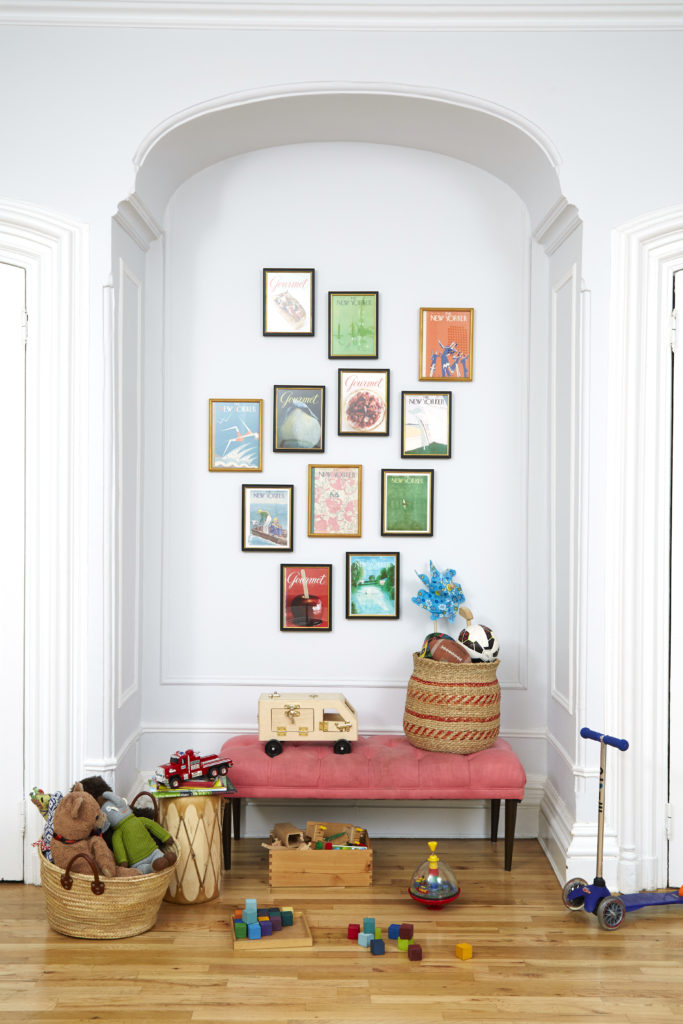 Cate had a quite a unique art assortment, including this collection of vintage magazine covers, which we planned to hang, gallery style, in a recessed archway in her home. We arranged the frames on the floor first to ensure the overall collection was perfect before it was hung.