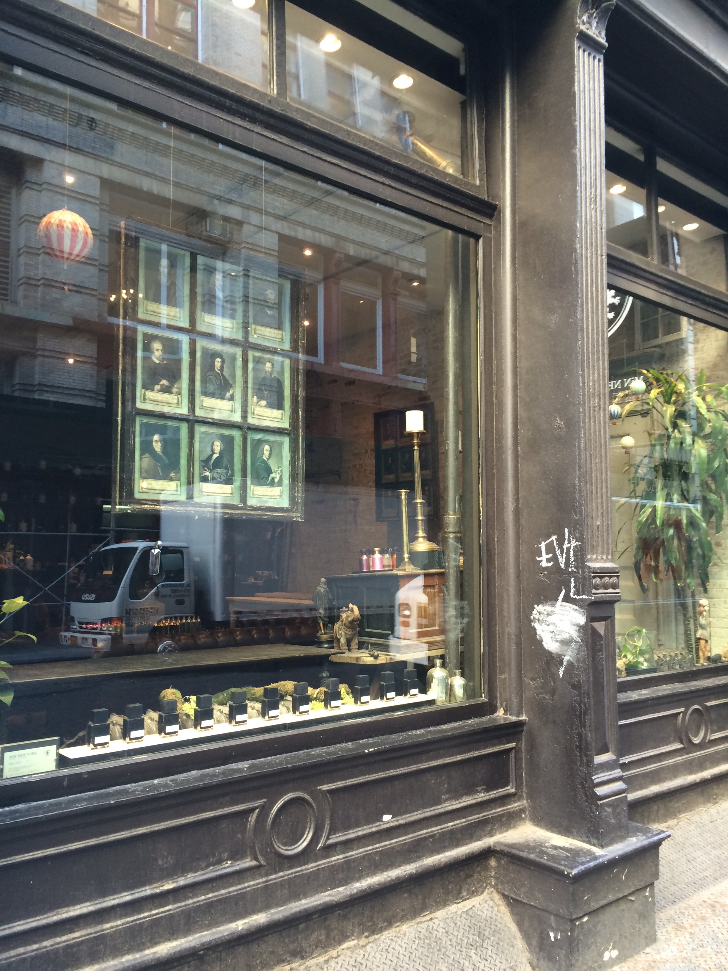 Here, a series of photos were hung in a single frame and suspended in front of a Manhattan retail storefront.
