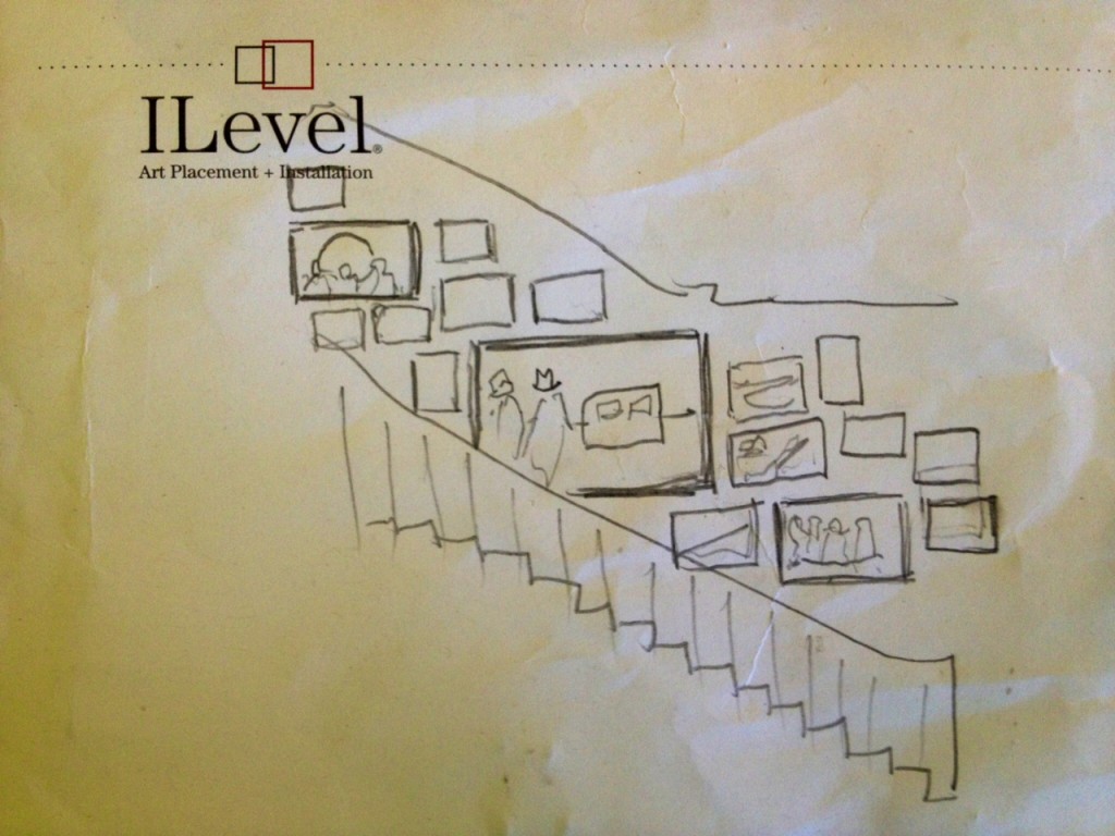 “For this installation, the client had a grouping of about 17 pieces to go on the wall above the staircase,” says Alan, the ILevel installer who completed the job. “We agreed that the three largest pieces, which were also in color, should be spaced throughout the wall and the smaller black and white ones would fill in the gaps. There was some debate as to where the largest piece should go so I made two sketches. One layout showed the piece at the middle of the composition, the other showed it lower down the stairs. After drawing them out the client and I agreed that it looked best in the middle.”